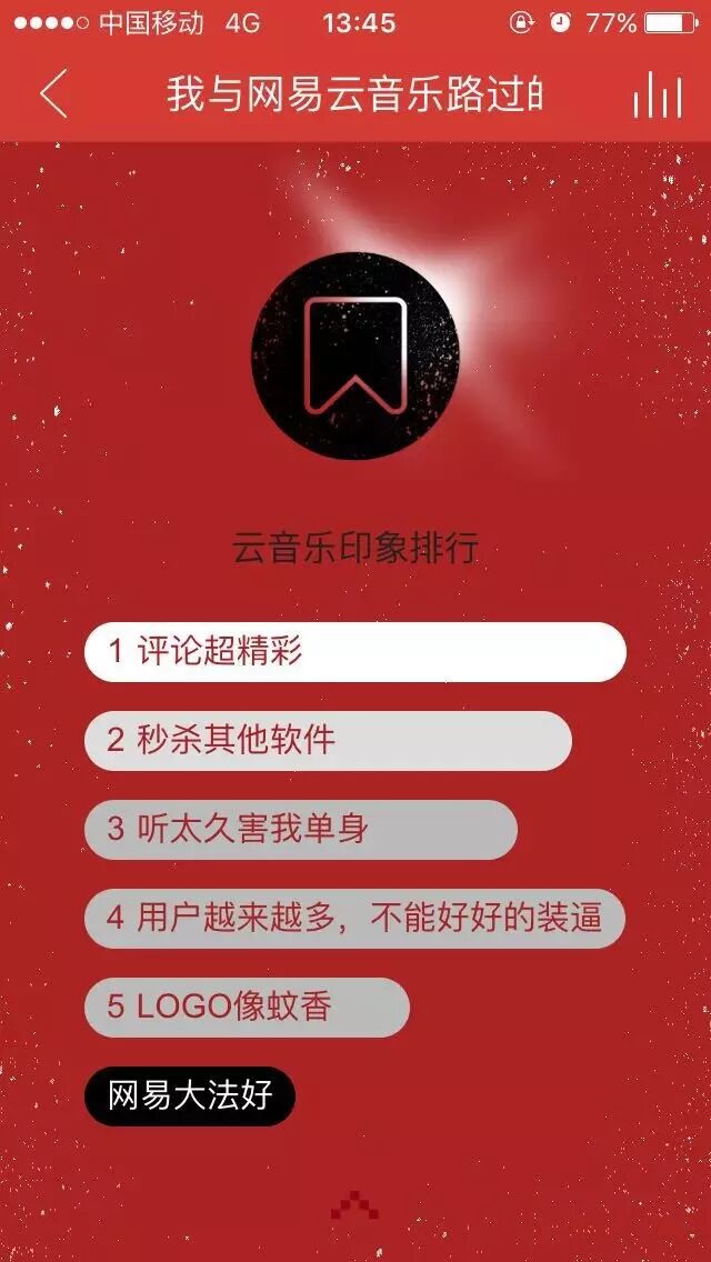 @Mr-牙:看我這些數據,就知道我是一個低調的神經病。還有,我聽最多的明明是Ken的《平靜內心》,為什麼是綠洲的《我過時瞭》?其實這兩首都超級喜歡。2016年希望雲村越來越大,村民越來越多,還有,最重要的:曲庫小護士越來越漂亮,來給我打一針。