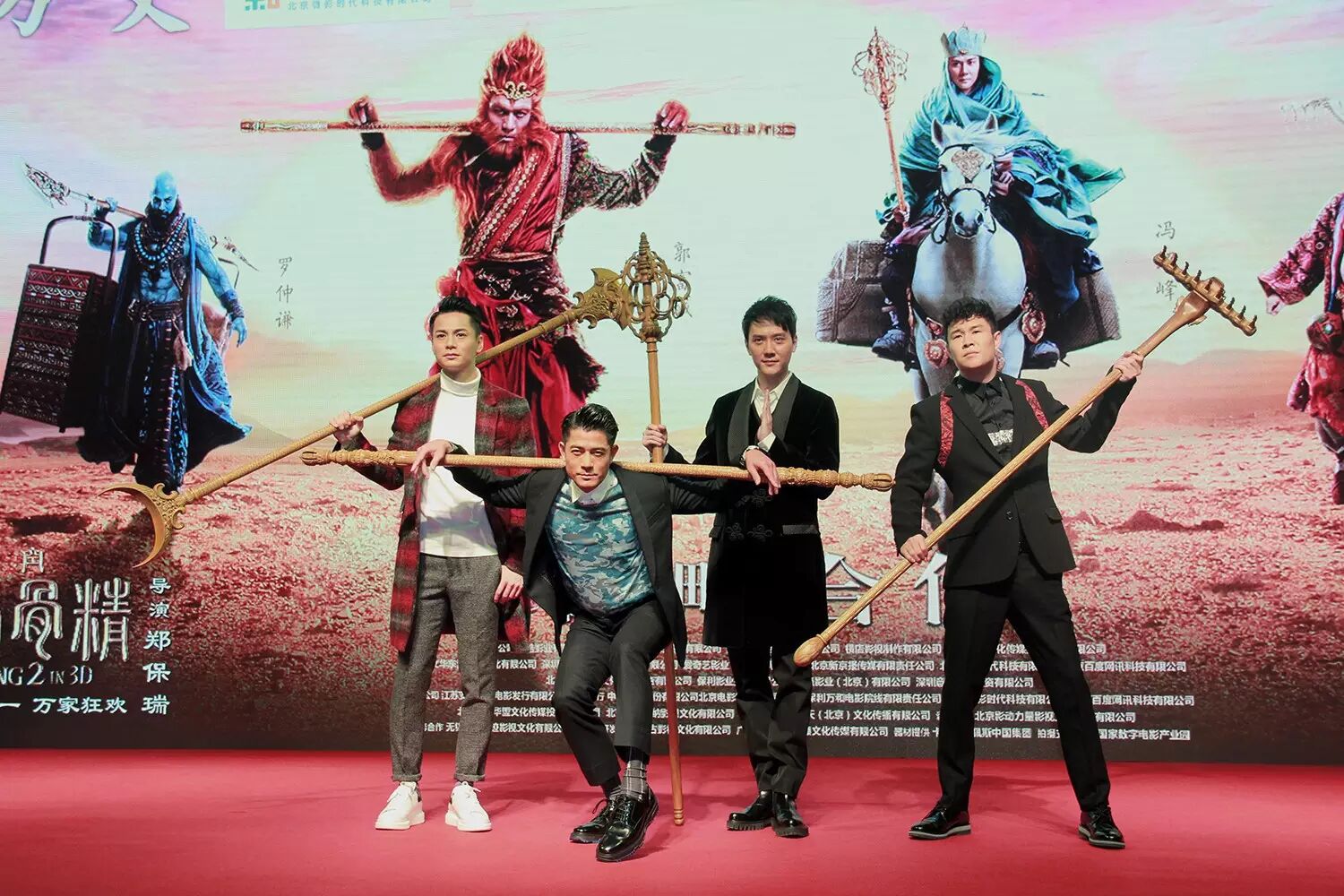 四師徒的飾演者郭富城、馮紹峰、小沈陽、羅仲謙再次會師上海,也將在《三打》中鍛造的高度默契帶到瞭現場。雖在戲裡是溫柔又正義感爆棚的師父,但作為本地人的馮紹峰現場耍起寶卻根本停不下來,仗著三個"徒弟"聽不懂上海話,大肆用上海話點評仨徒弟的特點,稱郭富城版孫悟空是"性子最沖,竟舍得下手打女妖",小沈陽版豬八戒是"眼睛小又色瞇瞇",羅仲謙版沙僧是"最能手頭把錢",主持人曹可凡會心地將這幾句"差評"用普通話翻譯成好評,卻被語言天賦過人的小沈陽直接戳破:"我全都聽明白瞭,沒一句好話",引起四下笑聲。當被問各自所飾演的角色有什麼不同於以往的特點時,郭富城稱:"我這一版的孫悟空結合瞭我三十年的舞蹈功底和二十年的武術功底,會非常不一樣",馮紹峰幽默接話:"他(郭富城)在戲裡對白骨精就是'對你打,打,打不完'";小沈陽大言不慚堅持自己是顏值擔當:"我顏值高這點就不要再提瞭,大傢有目共睹",馮紹峰又實力補刀:"你我本無緣分,全靠你的顏值在死撐",盡顯段子手本色。作為土生土長的"上海唐僧",馮紹峰總結自己這個版本的唐僧有不少上海男人的特點:"善良,溫暖,正義感強,話嘮",羅仲謙則稱自己飾演的沙僧外形酷似阿凡達和藍精靈,但比以往的沙僧都要能打,霸氣十足。互動結束後,四師徒各自手拿自己在片中的法器合影,並分別擺出與背景大屏幕"雄心萬丈"版海報上相同的姿勢,郭富城肩扛金箍棒站在最前,勾肩拱腿現場還原猴王英姿,逼真"猴樣"驚艷全場。