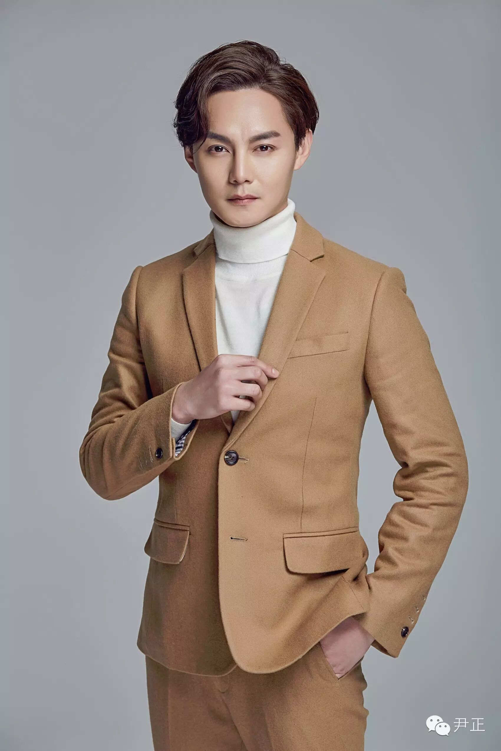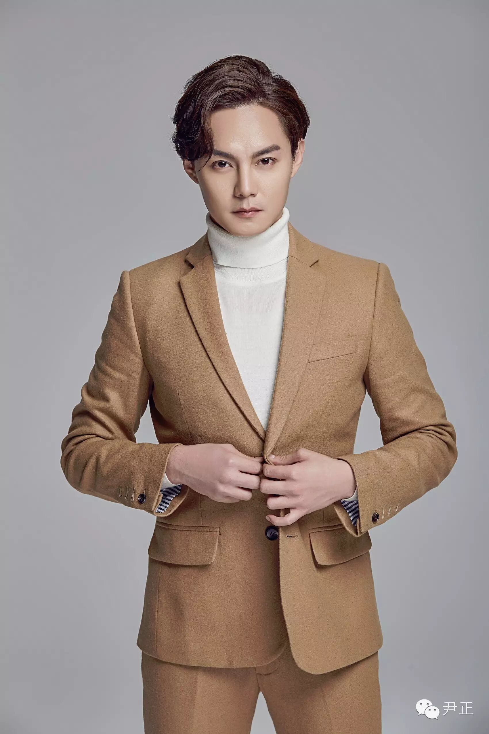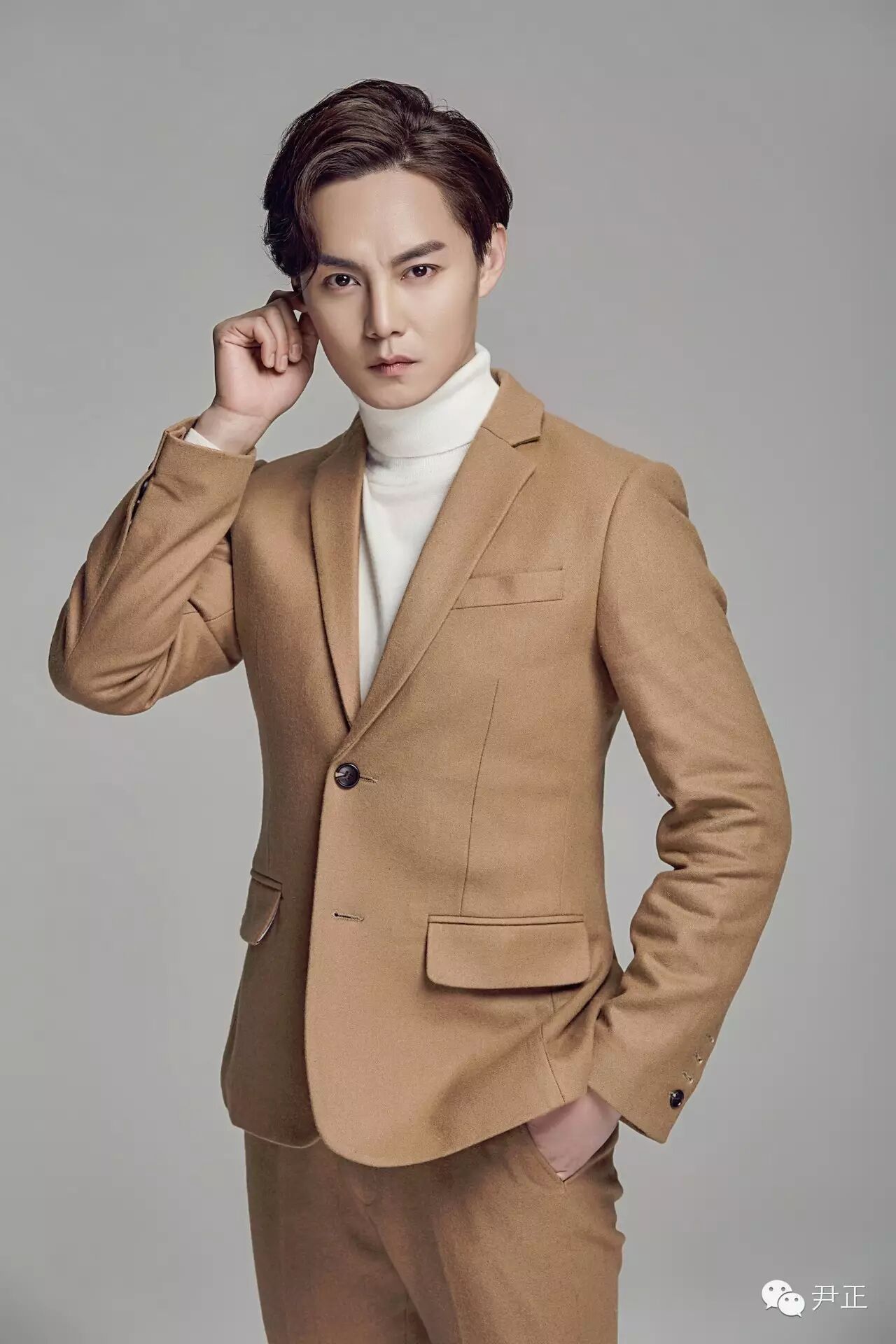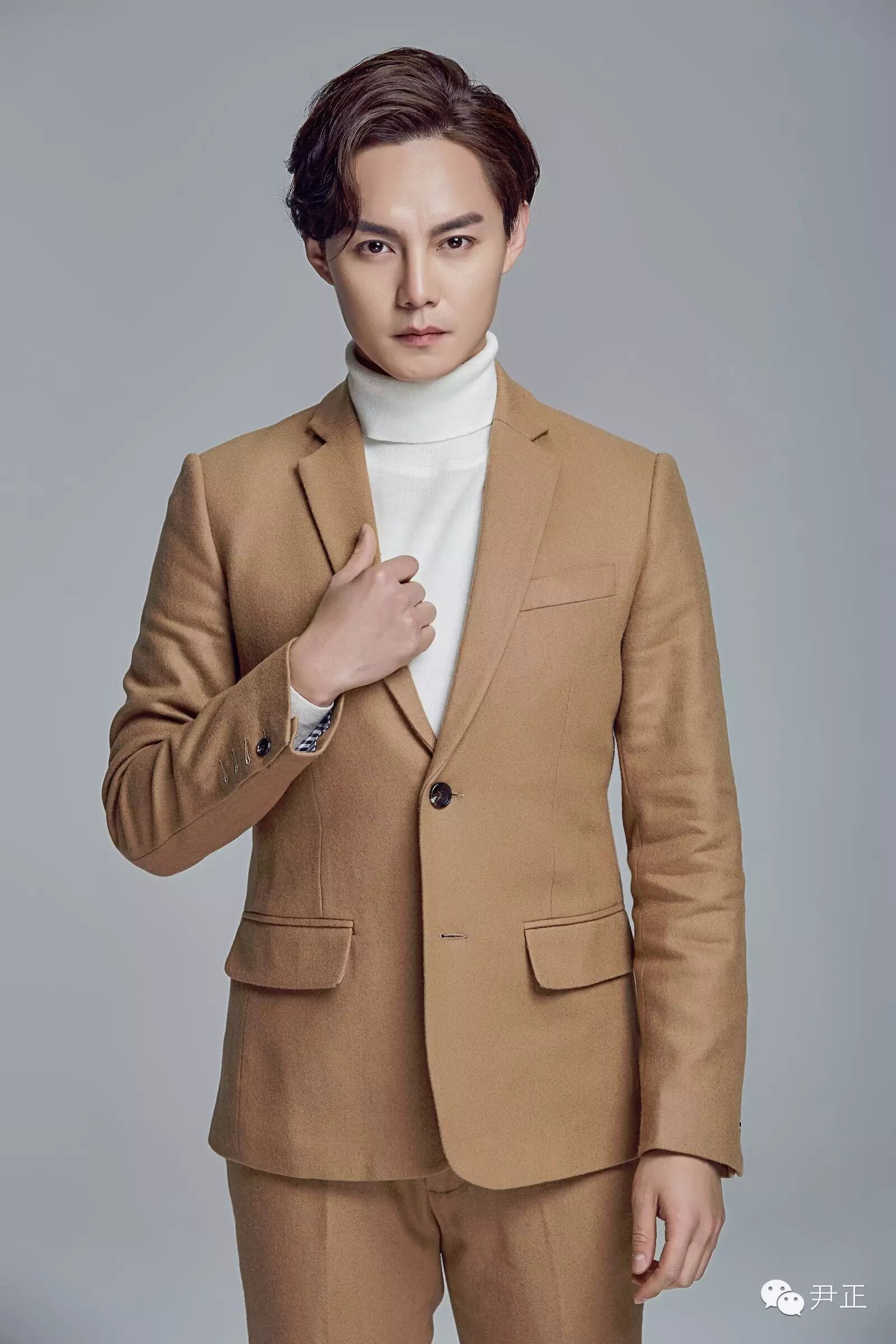 尹正這身駝色西裝套內搭白色高領毛衣,正兒八經拍出的"正經"寫真,依然幽默地帶著"嚴肅"的總裁范。