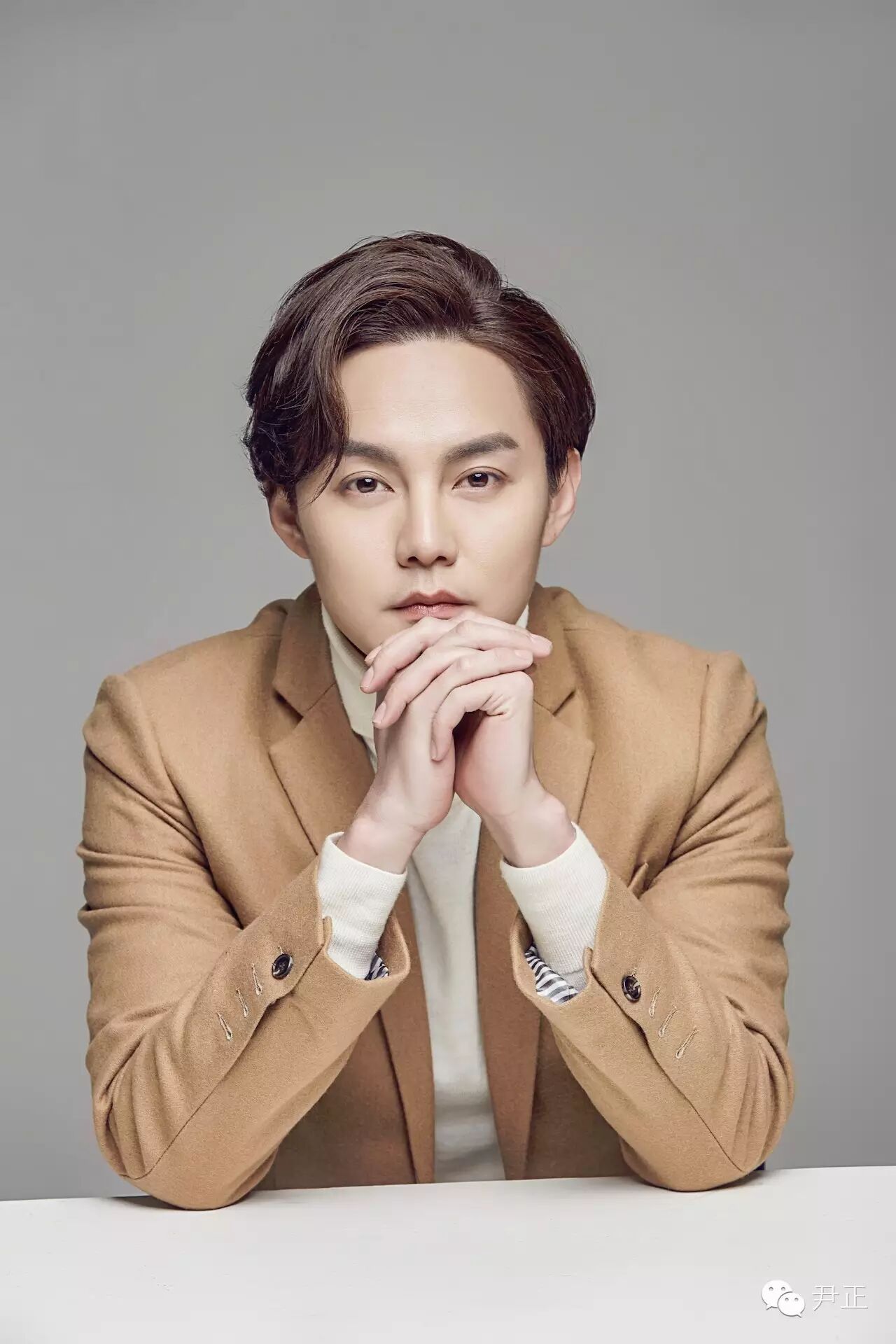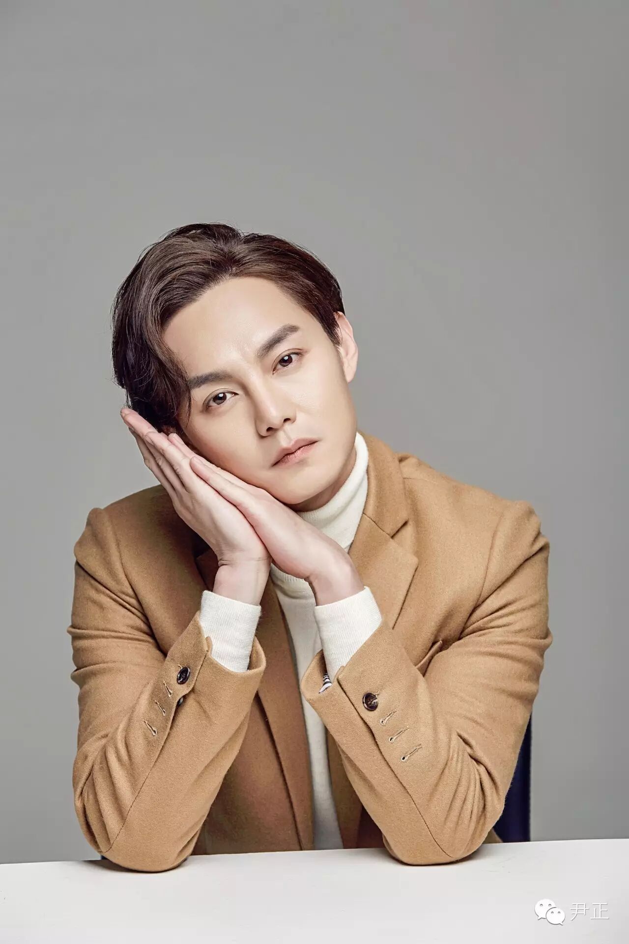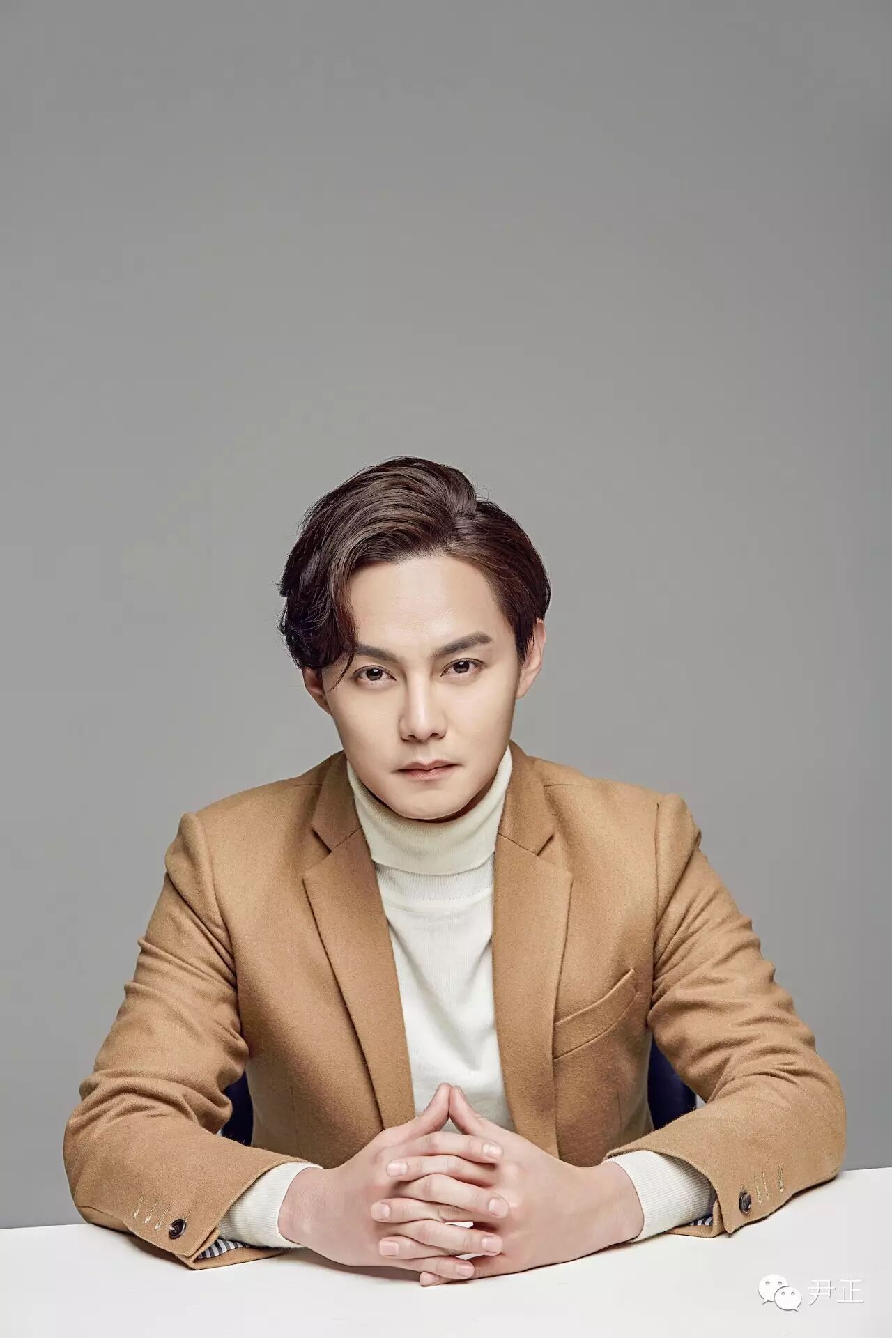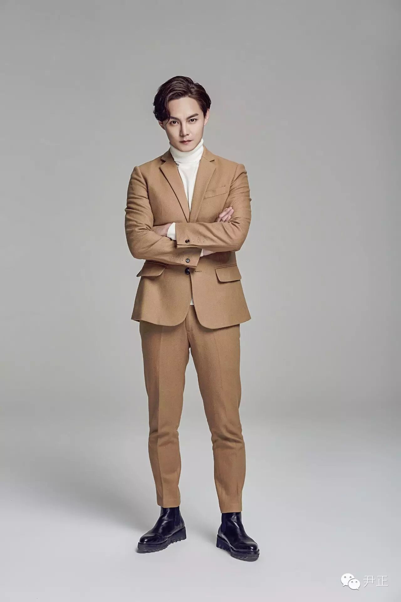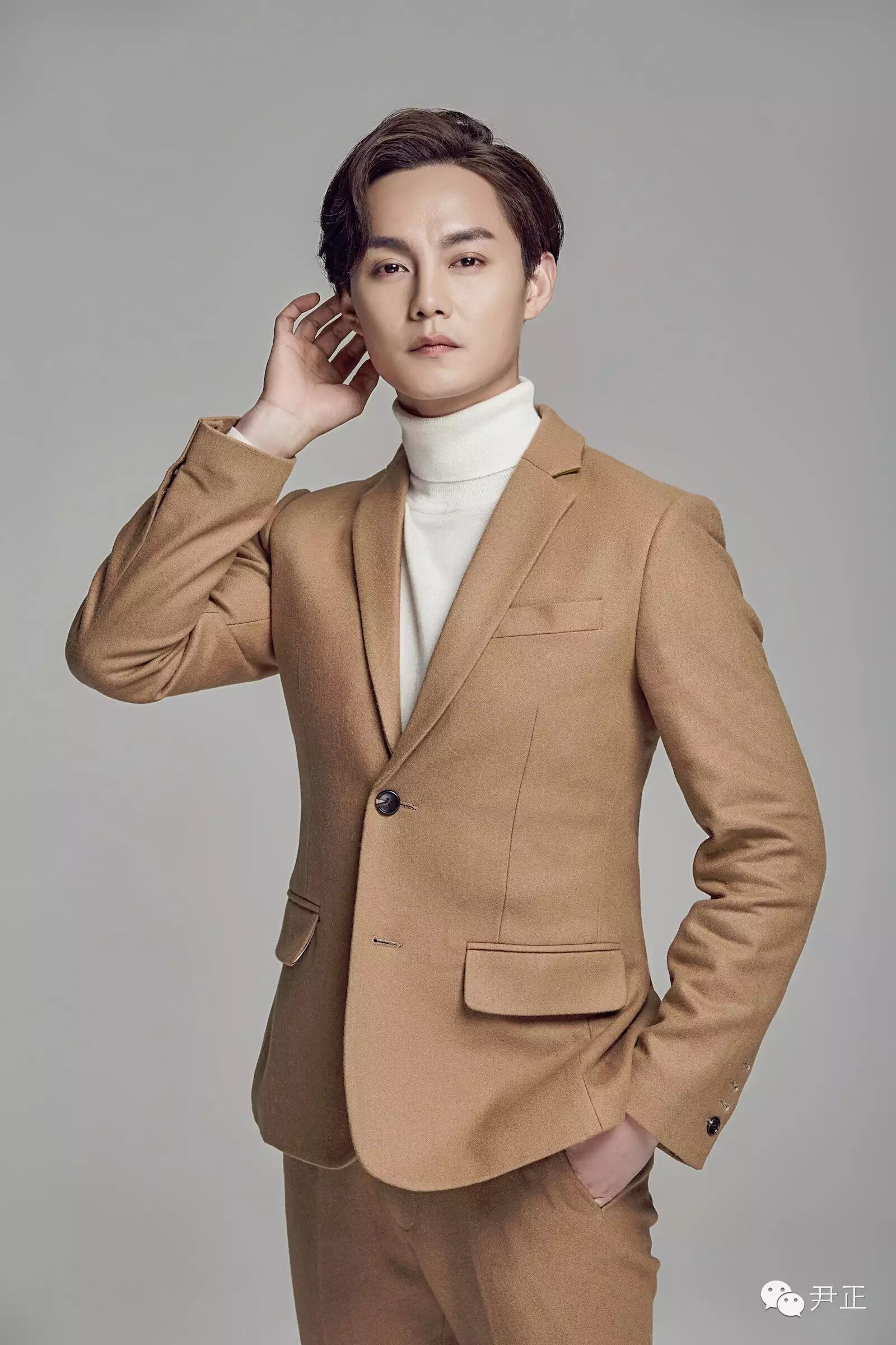 尹正這身駝色西裝套內搭白色高領毛衣,正兒八經拍出的"正經"寫真,依然幽默地帶著"嚴肅"的總裁范。