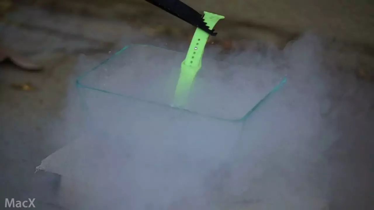 在第一段視訊中,Ryan 將 Apple Watch 運動版放入了含有液態氮的容器內,隨後又使用大錘將冰凍的 Apple Watch 擊碎。就像大部分 Ryan 的視訊一樣,相信結果已經不重要了,基本上沒有設備可以存活。