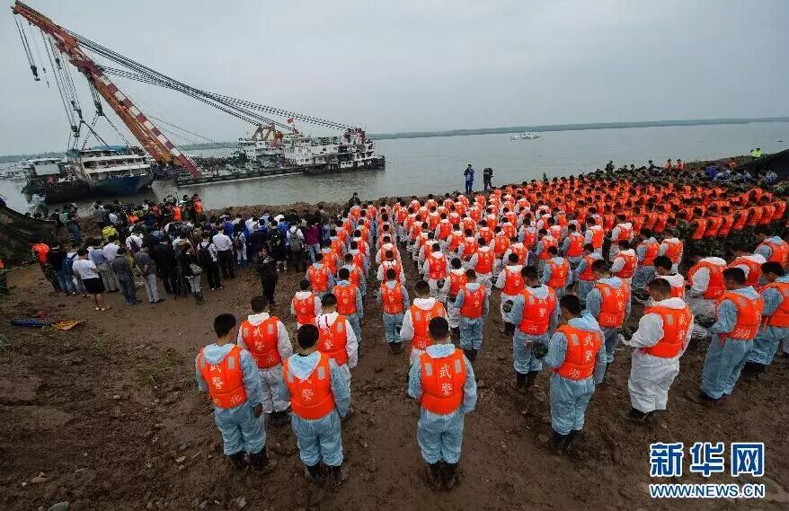6月7日,在湖北監利,「東方之星」號客輪翻沉事件救援現場舉行哀悼遇難者活動,現場所有人員肅立默哀3分鐘,船舶同時鳴笛3分鐘。