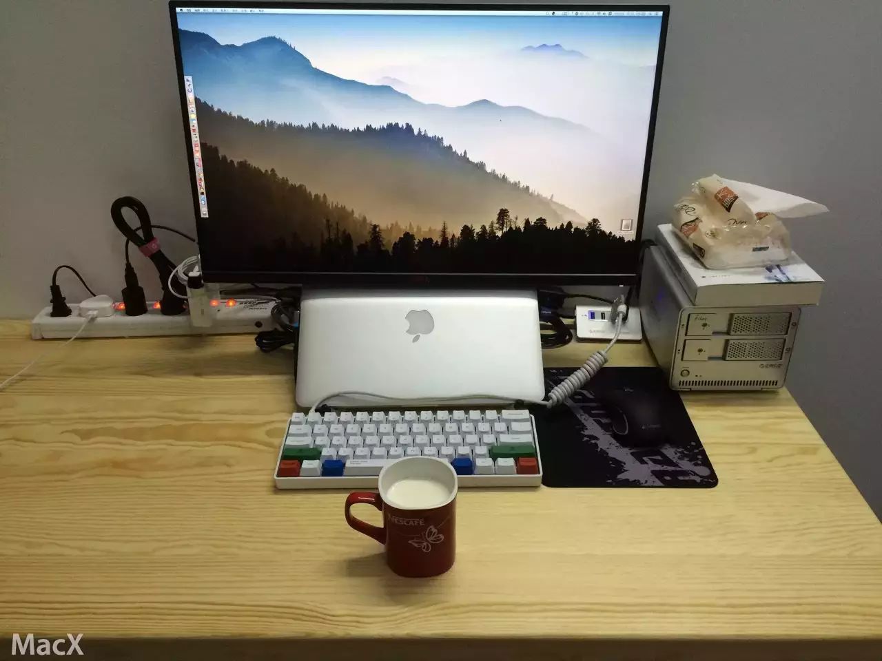 在分享中, 我們看到了有一個將 MacBook Pro 13英寸變身為桌面機的做法. 可見這MacBook Pro 可真是移動辦公與桌面應用的得力助手, 使用顯示器可以在桌面上獲得更大的操作空間. 仔細看, MacBook Pro通過轉接器將USB口少的問題輕鬆化解.