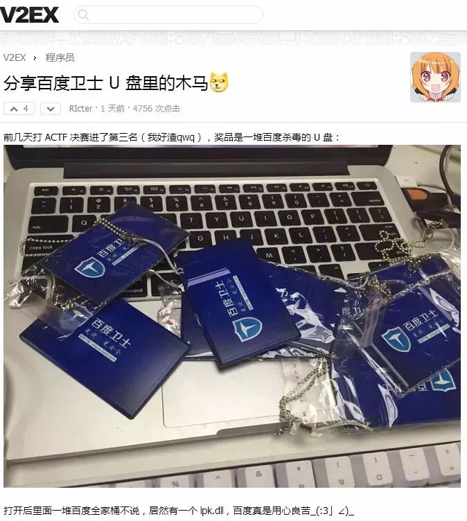 自己參加ACTF大賽,獲得了第三名的成績,獎品是百度送的一堆百度U盤,但是該程式員開啟U盤後發現,U盤裡不僅裝有百度衛士、百度殺毒、百度瀏覽器等百度「全家桶」軟體,更讓人意外的是:U盤裡還裝了木馬病毒檔案!!!