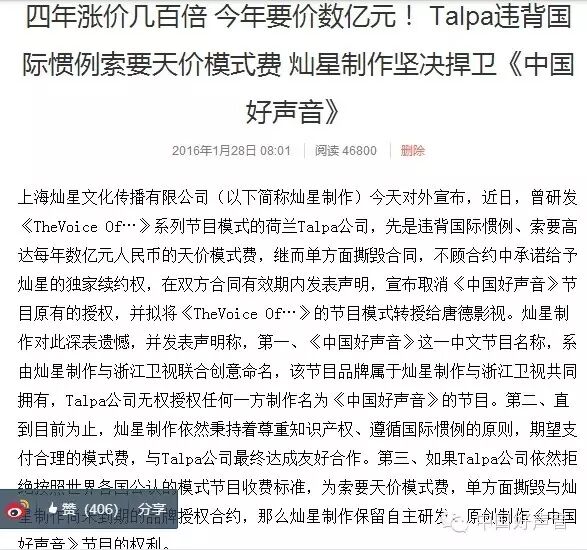 1月28號,上海燦星文化傳播有限公司(燦星制作)發佈聲明,稱其引進的《The Voice Of…》模式遭遇版權方Talpa公司的單方面毀約行為,在雙方續約談判期間,Talpa卻散佈消息稱,擬將《The Voice Of…》模式轉授給唐德影視,燦星制作必須支付每年幾億元人民幣的天價模式費,才有望搶回模式。燦星制作為此表示,如Talpa堅持天價模式費的不合理需求,導致雙方談判破裂,那麼燦星制作將全新研發模式,制作完全自主原創的《中國好聲音》節目。