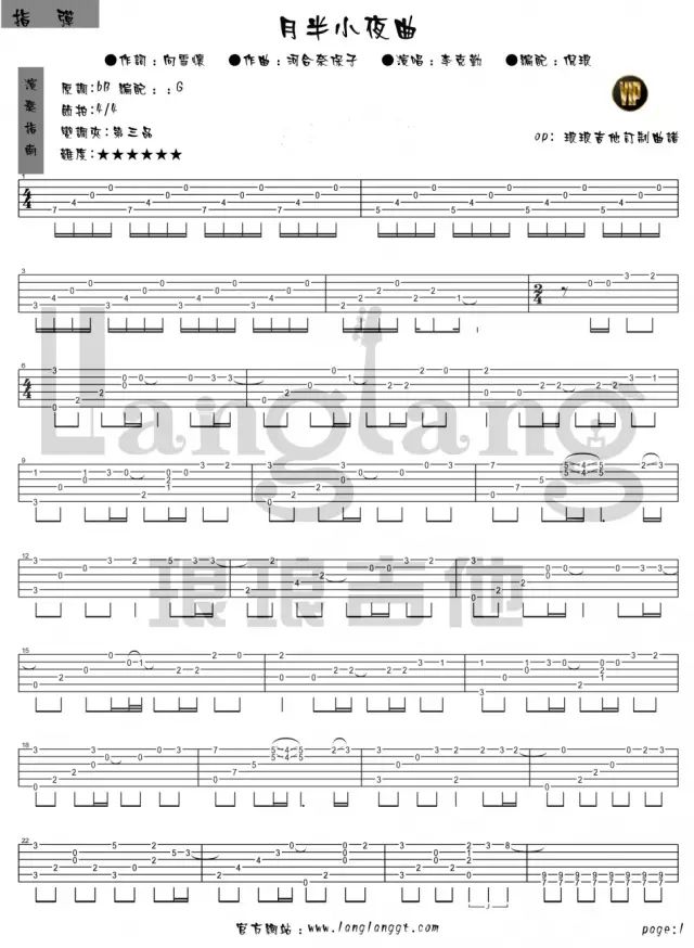 《月半小夜曲》為李克勤效力於寶麗金唱片公司時期的第一張(EP除外)個人專輯《命運符號》,發行於1987年,是翻唱日本80年代巨星河合奈保子作曲並演唱的 ハーフムーン·セレナーデ。《月半小夜曲》粵語版是向雪懷作詞,李克勤演唱,成為當時紅極一時的作品。陳慧嫻在2008年活出生命演唱會也演唱過這首歌曲。2014年8月1日晚,《中國好聲音》第三季第三期的節目的一位香港學員陳樂基以這首《月半小夜曲》驚艷全場,獲得4位導師的轉身。《月半小夜曲》成為中國好聲音舞臺上的第一首粵語歌!指彈版譜由"瑯瑯吉他"提供,難度不算很高,比較容易上手,強烈推薦!更多瑯瑯吉他的吉他譜在這裡:【瑯瑯吉他】吉他譜合集http://www.jitashe.net/collection/2057/
