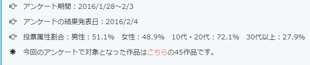 期萬人評選的主題是——可以追下去的1月新番。正所謂群眾的眼睛是雪亮的,哪些好看哪些值得看,經過人民群眾的篩選,自然是值得參考的。那麼接下來就來看看網友們都覺得哪幾部1月番好看呢?投票屬性:男性:51.1% 女性:48.9% 10歲·20歲:72.1% 30歲以上:27.9%這部由三部敬原作改編的動畫有著強大的原作基礎,紮實的腳本和過硬的劇情加上充滿懸疑的敘述方式無時無刻不抓住每位觀眾的心,讓人在每集的結束都對下集抱著想要知道的沖動。作為無頭騎士系列第二季三部曲的最後一部,本作將揭曉故事的多個謎題,無頭騎士到底能否拿回自己的頭顱,各路主角又將何去何從?喜歡本系列的粉絲自然不能錯過。以鄉下粗點心店為故事舞臺,輕松搞笑的戀愛喜劇讓人懷念起夏天的味道。女主角枝垂螢傲人的歐派更是成瞭本作另一大賣點。熱愛遊戲的傢裡蹲少年·佐藤和真的人生,因交通事故(!?)而輕易閉幕……本該是這樣,但當他醒來之時,眼前有一位自稱是女神的美少女。"喂,我有點好事要告訴你。要去異世界嗎?隻帶一樣你喜歡的東西沒問題喔。""那,我就帶著你好瞭。"由此開始,在異世界轉生的和真的魔王討伐大冒險開始瞭……TV版是將劇場版前半分割成tv的長度播放,前幾集都還是劇場版的內容,相信在過半之後就會有新故事登場瞭。《GATE 奇幻自衛隊》是由柳內巧所著的所屬於AlphaLight文庫的作品。最初隻是柳內巧在網上連載的小說,受到網友的喜愛後,於2010年4月正式出版。現在累積發行量已經超過瞭150萬本,也授權推出瞭同名漫畫和動畫。講述日本陸上自衛隊使用近代兵器在異世界戰鬥的充滿娛樂精神的奇幻故事。電視動畫《疾走王子》改編自PSV運動題材的乙女向遊戲的電視動畫,起初因為「方南學園疾走社」比賽影片而對此項運動非常著迷的少女「櫻井奈奈」,高中進入方南學園高中就讀後,為瞭重振即將廢社的疾走社,與疾走社的少年們相遇,跨越障礙以高中疾走競賽的頂點——東日本大會「End of Summer」為目標邁進。京阿尼時隔半年之後的又一新作,講述的是怪靈存在的世界和同怪靈們戰鬥的少男少女們的故事。和《粗點心》一樣,本作的女主角的歐派同樣是一大賣點。15.ACTIVE RAID -機動強襲室第八系-