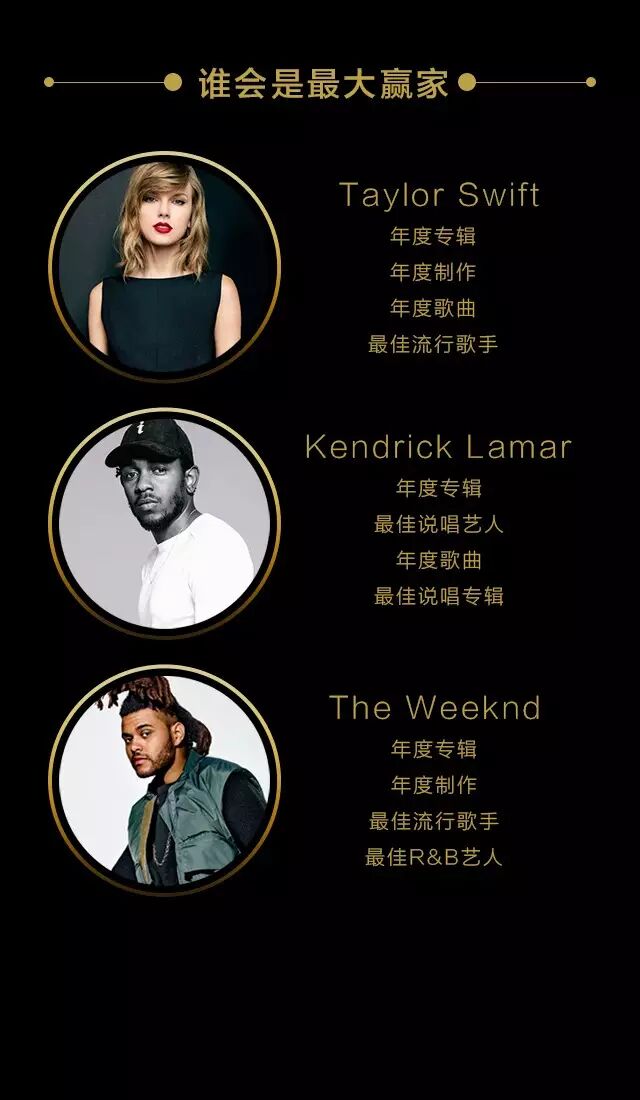 Taylor Swift , The Weeknd, Kendrick Lamar 三人勢均力敵,之外還有很受學院派評委喜歡的 Alabama Shakes, 誰能獲獎隻能說就看天枰向誰傾斜瞭。