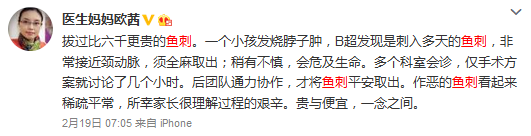 雖然距離事件發生已過去2個餘月,但在醫療圈仍然不斷發酵,#天價拔魚刺#的話題閱讀量已經達到636.1萬。今日,兒科專傢、微博大V@醫生媽媽歐茜 在微博上發佈道: