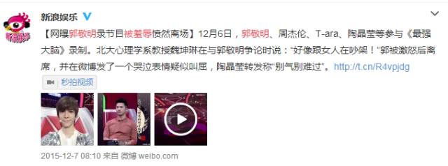 12月7日,網上有視頻曝出,在《最強大腦》的錄制現場,郭敬明和魏坤琳發生爭執,魏坤琳脫口而出:"怎麼好像在跟女人吵架。"郭敬明被激怒,憤然離場。