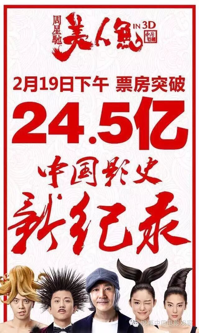 截止2月19日18:30時,《美人魚》斬獲24.5億票房,成為中國影史上票房最高的影片。這部由周星馳執導的電影,自2月8日全國公映以來,幾乎每天都在刷新著中國影史的的各項紀錄:首日票房紀錄、單日票房紀錄、內地票房新冠,這一過程僅用瞭12天時間。
