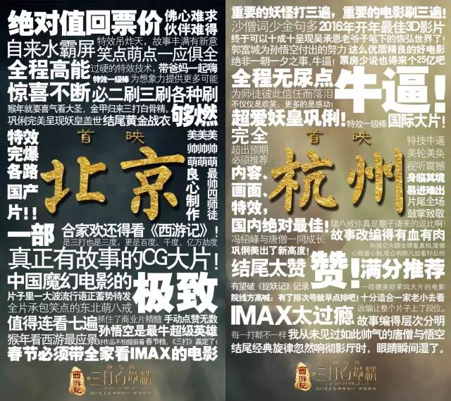 這就是馬上要在2月8日上映的電影《西遊記之孫悟空三打白骨精》,而這兩張圖是電影在北京、杭州前兩站首映後的內部口碑匯總。盡管離猴年初一上映還有段時間,但這片已開始挑逗全國觀眾胃口瞭——小編就想弱弱地問一句,正在全國路演的《三打》啥時候到我們這疙瘩啊?
